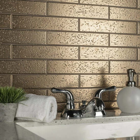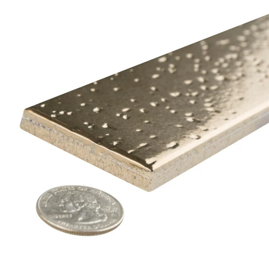 Our Muretto Oro Glossy 2″x 10″ Porcelain Wall Tile enhances spaces through a refreshing combination of timeless design and unique texture. This elongated gold toned subway tile features natural bumps and grooves that flow dynamically throughout each piece. To add further contrast and dimension to the design, this wall tile features a highly reflective glossy finish and an undulated surface that creates visual rhythm and depth. This stylish design is visually appealing and versatile, blending beautifully with a range of looks from vintage industrial to modern day. Its impervious and frost-resistant features make it an ideal choice for indoor and outdoor wall installations including kitchen backsplashes, shower walls and fireplace facades. Tile is the better choice for your space. This tile is made from natural ingredients, making it a healthy choice as it is free from allergens, VOCs, formaldehyde and PVC.