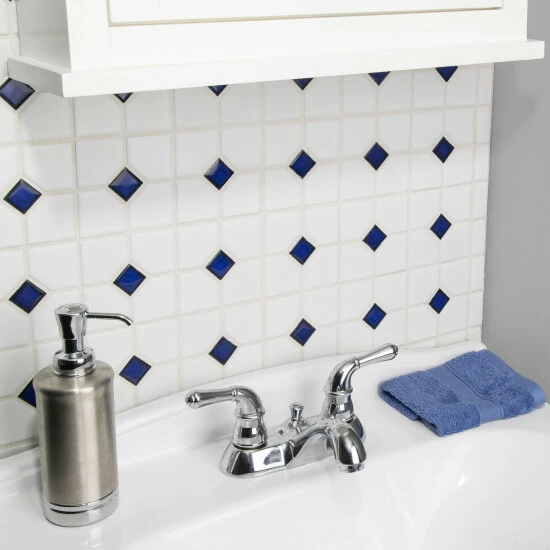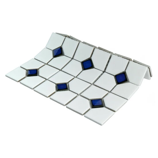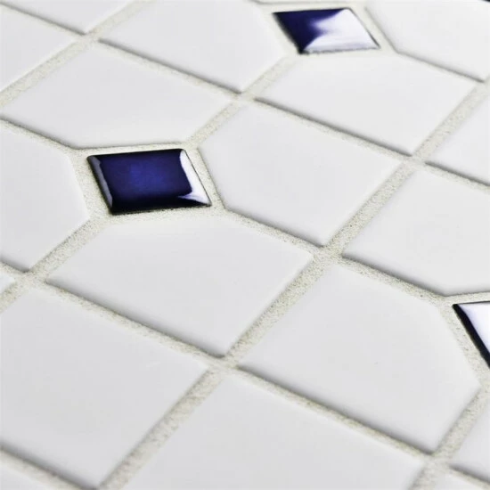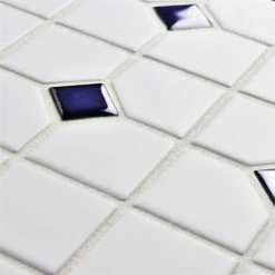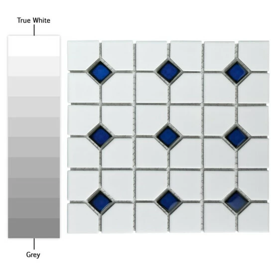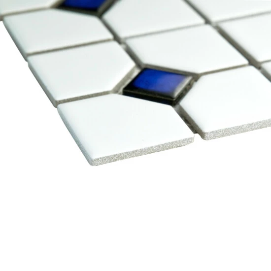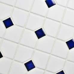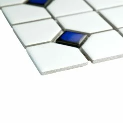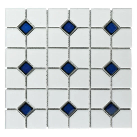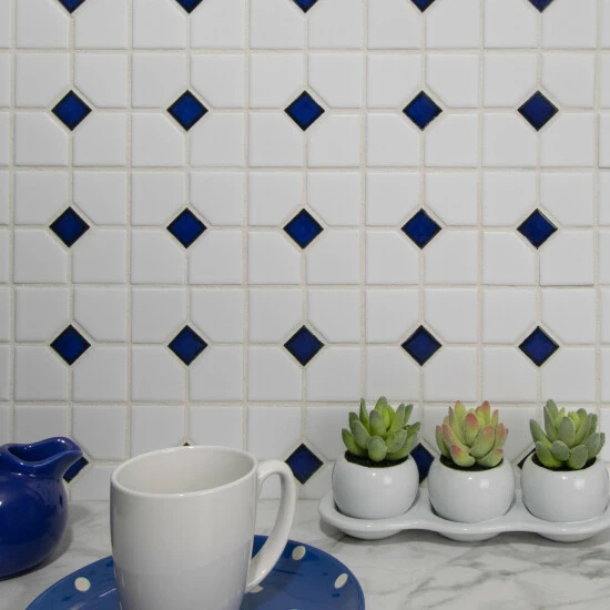 The Oxford Matte White with Cobalt Dot 11-1/2 in. x 11-1/2 in. x 6 mm Porcelain Mosaic Tile offers a traditional look that will fit within any design scheme. The soft matte finish on the white background and glossy finish on the cobalt blue diamonds exudes a classic look that never goes out of style. This mosaic tile has a mesh backing for easy installation. With a water absorption rating of less than 0.5%, this tile is a fit for any space including moisture-heavy or outdoor areas.