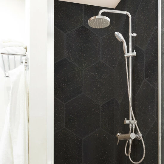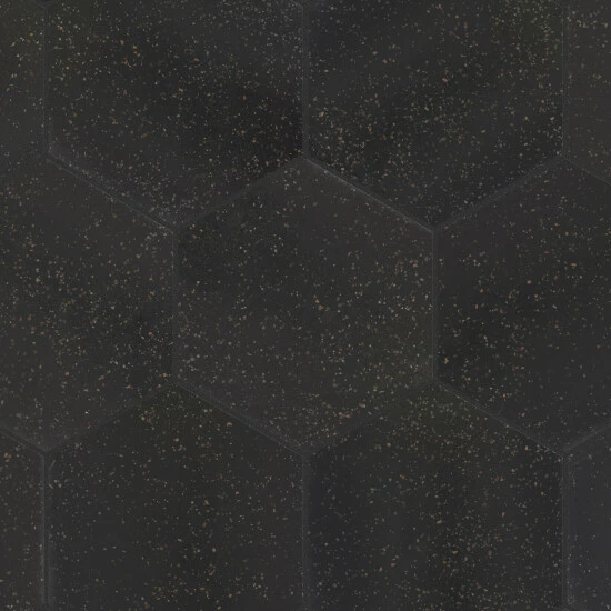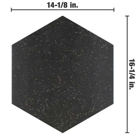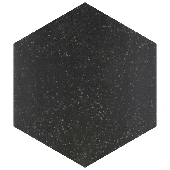 Replicating a worn concrete appearance with floating fragments of stones, our Palazzo Hex Nero Porcelain Floor and Wall Tile lends a burst of terrazzo-look energy to any space. This hexagon tile features speckled pattern variations in grey and brown tones that are set on a charcoal black base glaze, offering subtle contrast and dimension to the design. The smooth, matte surface features a weathered, mottled look, replicating the beauty of aged stone tile. This trendsetting display of speckled neutral tones is visually appealing and versatile, and blends beautifully with a range of design styles from vintage industrial to modern day. Its impervious, frost-resist, and durable features make it an ideal choice for indoor and outdoor installations including kitchens, bathrooms, backsplashes, showers, entryways, and patios. Tile is the better choice for your space. This tile is made from natural ingredients, making it a healthy choice as it is free from allergens, VOCs, formaldehyde, and PVC.