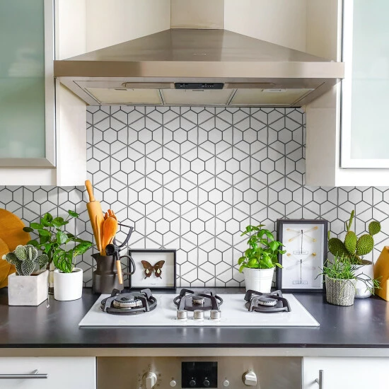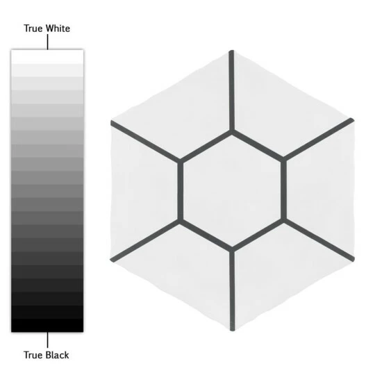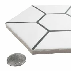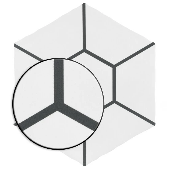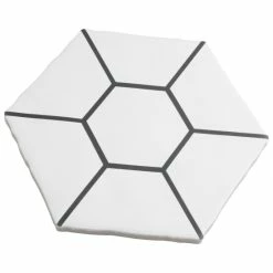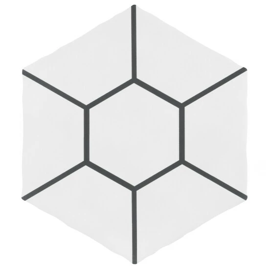 Offering a unique blend of monochromatic colors and lines, our Palm Honeycomb Hex White 6″ x 7″ Porcelain Floor and Wall Tile captures the simplicity of mid-century modern design. This hexagon shaped tile creates captivating visual effects through linear geometric patterns that extend across the surface. Charcoal black lines are set amongst an off-white backdrop that has subtle variations that are meant to replicate genuine hydraulic tiles. This dynamic display of geometric pattern is visually appealing and versatile, and can redefine spaces through a graphic aesthetic. To add further contrast and dimension to the design, this matte floor and wall tile features slight surface undulation and subtle edge irregularities, offering an organic handcrafted appearance. Its ADA-compliant, impervious, frost-resistant and durable features make this an ideal choice for both commercial and residential indoor and outdoor installations including, kitchens, bathrooms, backsplashes, showers, hallways, entryways, patios and fireplace facades. Tiles in our Palm Collection are bicottura or double-fired, which ensures each tile is precisely calibrated to allow for installation consistency and the use of tighter grout joints. The second firing of the tile creates a stunning rich glazing effect that cannot be achieved with a single fire process. These tiles are also mono-color, meaning the colors remain consistent between production runs. Tile is the better choice for your space. This tile is made from natural ingredients, making it a healthy choice as it is free from allergens, VOCs, formaldehyde and PVC.
