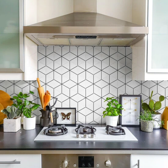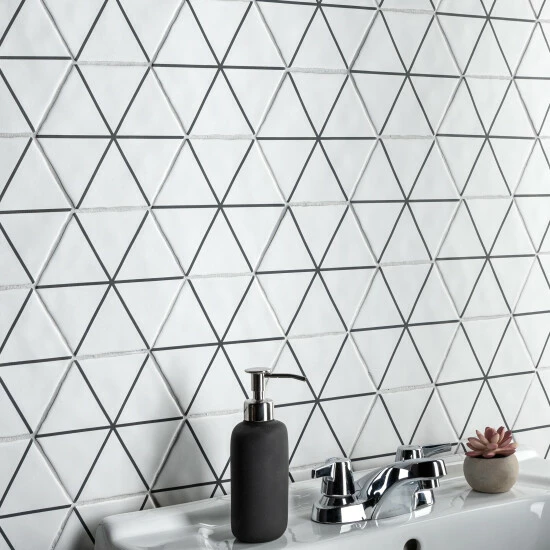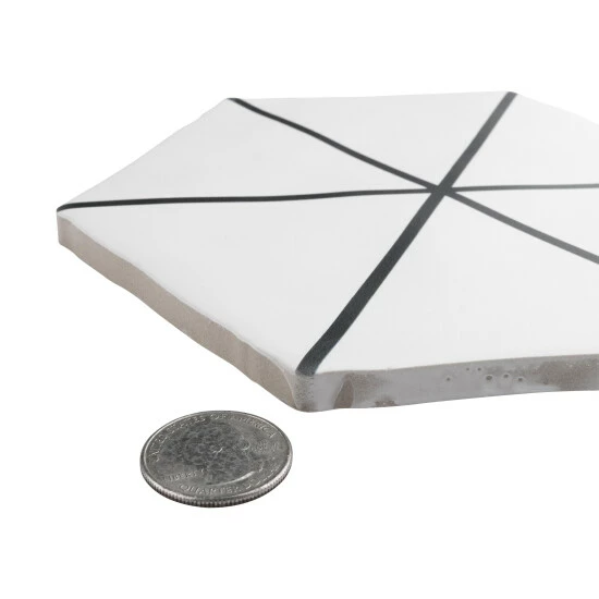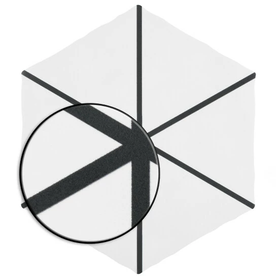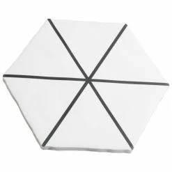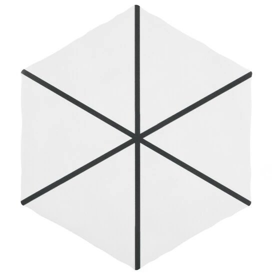 Offering a unique blend of monochromatic colors and lines, our Palm Windmill Hex White 6″ x 7″ Porcelain Floor and Wall Tile captures the simplicity of mid-century modern design. This hexagon shaped tile creates captivating visual effects through linear triangle patterns that extend across the surface. The tile can be laid out in various different patterns to create a one-of-a-kind installation. Charcoal black lines are set amongst an off-white backdrop that has subtle variations that are meant to replicate genuine hydraulic tiles. This dynamic display of geometric pattern is visually appealing and versatile, and can redefine spaces through a graphic aesthetic. To add further contrast and dimension to the design, this matte floor and wall tile features slight surface undulation and subtle edge irregularities, offering an organic handcrafted appearance. Its ADA-compliant, impervious, frost-resistant and durable features make this an ideal choice for both commercial and residential indoor and outdoor installations including, kitchens, bathrooms, backsplashes, showers, hallways, entryways, patios and fireplace facades. Tiles in our Palm Collection are bicottura or double-fired, which ensures each tile is precisely calibrated to allow for installation consistency and the use of tighter grout joints. The second firing of the tile creates a stunning rich glazing effect that cannot be achieved with a single fire process. These tiles are also mono-color, meaning the colors remain consistent between production runs. Tile is the better choice for your space. This tile is made from natural ingredients, making it a healthy choice as it is free from allergens, VOCs, formaldehyde and PVC.Β