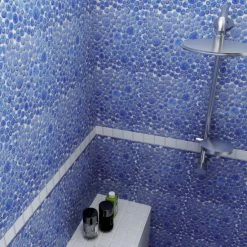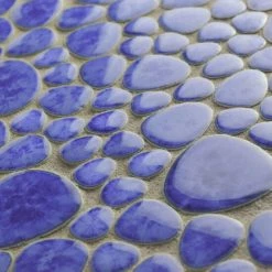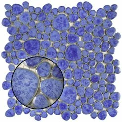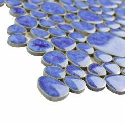 This Pebble Blue Cloud 11 in. x 11 in. x 6 mm Porcelain Mosaic Tile features a high-gloss blue glaze with milky and gray accents for a beautiful, organic effect to enhance any space whether commercial or residential. The impervious nature of the pebble-shaped tiles makes the mosaic an ideal design element for baths, spas, kitchens or pool trim, the low water absorption making it frost resistant for outdoor use but the glaze causes the surface to be marginally skid resistant when wet and so is recommended for indoor floor use. Tile is the better choice for your space. This tile is made from natural ingredients, making it a healthy choice as it is free from allergens, VOCs, formaldehyde and PVC.