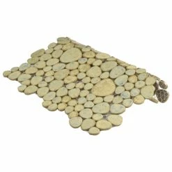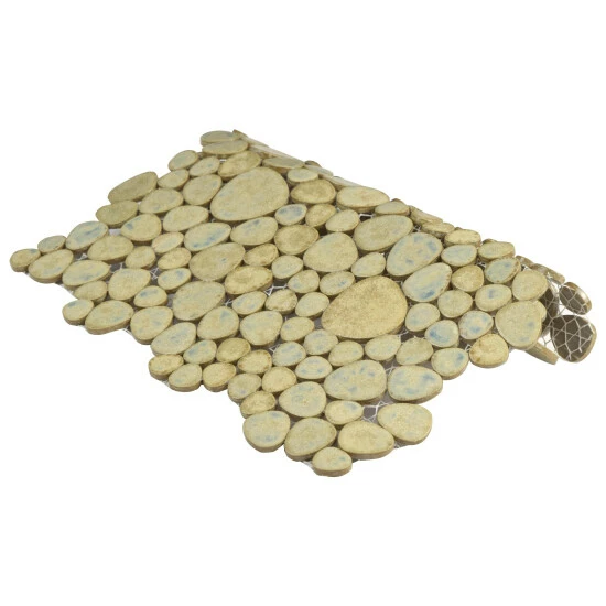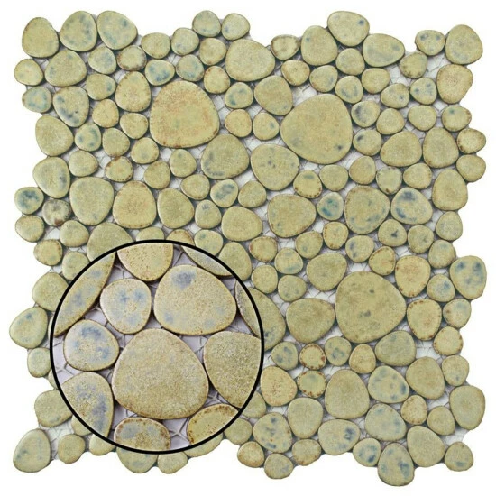 The Pebble Green Moss 11 in. x 11 in. x 6 mm Porcelain Mosaic Tile incorporates organic shapes and randomly sized pebble-shaped tiles to create an exciting aesthetic touch. This nature-inspired tile features a glazed surface and comes in a pale, moss-green color with random bursts of warm and cool earth tones to create a look that complements a variety of design schemes. The strong mesh backing material makes for easy installation and the durable porcelain material and impervious water absorption rating make this tile a great choice for indoor and outdoor applications. Tile is the better choice for your space. This tile is made from natural ingredients, making it a healthy choice as it is free from allergens, VOCs, formaldehyde and PVC.