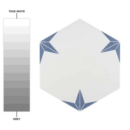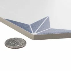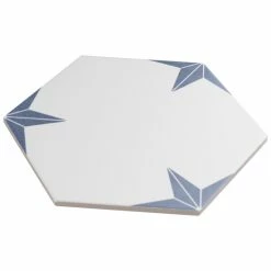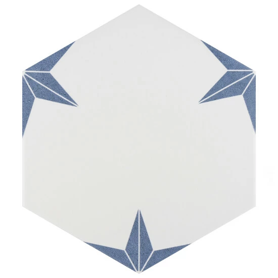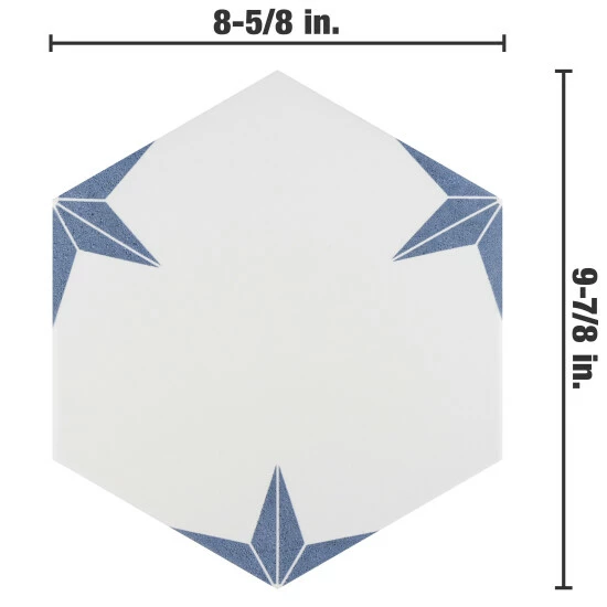 Our Stella Hex Azul 8-5/8″ x 9-7/8″ Porcelain Floor and Wall Tile transforms any space into a work of art through geometric patterns that when laid out, combine to create captivating star designs. Inspired by our Stella Azul 9-3/4″ x 9-3/4″ Porcelain Floor and Wall Tile, this hexagon version similarly features a chalky white color tone accented by faded denim blue triangular patterns along the edges. Its geometric shape is unique yet simple enough to integrate into any design, ranging from traditional style renovations to modern home projects. The smooth, satin glazed surface offers a sleek look that adds extra character to this floor and wall tile. Its impervious, frost resistant, and durable features make it an ideal choice for both commercial and residential indoor and outdoor installations including, kitchens, bathrooms, backsplashes, showers, hallways, entryways, patios, and fireplace facades. This tile is a perfect choice on its own or coordinated with other products in the Stella Hex series. Tile is the better choice for your space. This tile is made from natural ingredients, making it a healthy choice as it is free from allergens, VOCs, formaldehyde, and PVC.