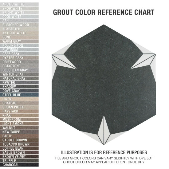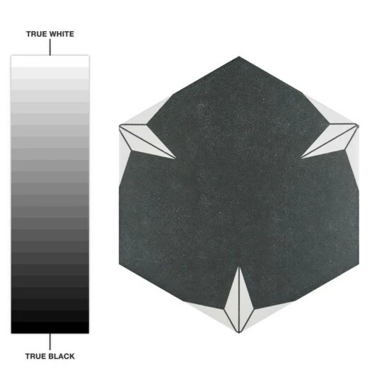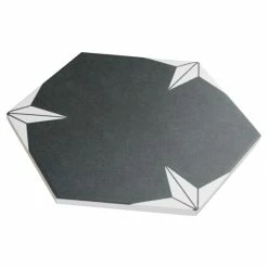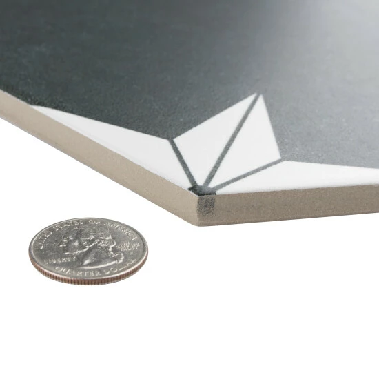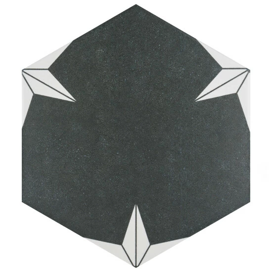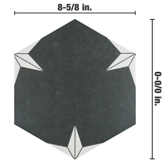 Our Stella Hex Night 8-5/8″ x 9-7/8″ Porcelain Floor and Wall Tile transforms any space into a work of art through geometric patterns that when laid out, combine to create captivating star designs. Inspired by our Stella Night 9-3/4″ x 9-3/4″ Porcelain Floor and Wall Tile, this hexagon version similarly features a faded charcoal black color tone accented by chalky white triangular patterns along the edges. Its geometric shape is unique yet simple enough to integrate into any design, ranging from traditional style renovations to modern home projects. The smooth, satin glazed surface offers a sleek look that adds extra character to this floor and wall tile. Its impervious, frost resistant, and durable features make it an ideal choice for both commercial and residential indoor and outdoor installations including, kitchens, bathrooms, backsplashes, showers, hallways, entryways, patios, and fireplace facades. This tile is a perfect choice on its own or coordinated with other products in the Stella Hex series. Tile is the better choice for your space. This tile is made from natural ingredients, making it a healthy choice as it is free from allergens, VOCs, formaldehyde, and PVC.