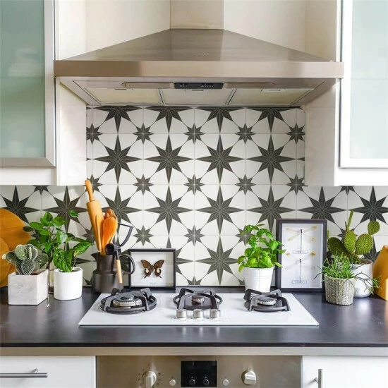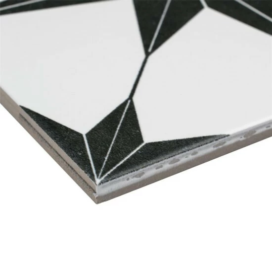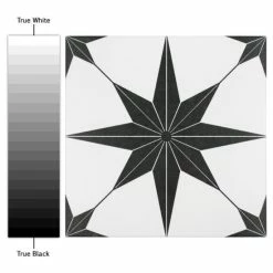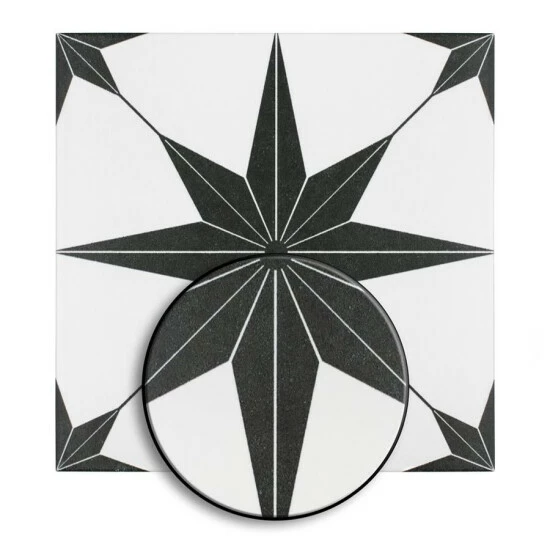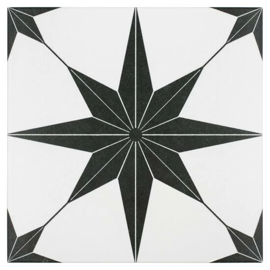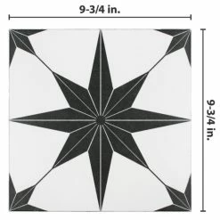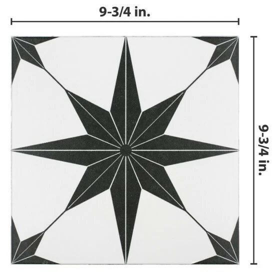 Our Stella Nero 9-3/4 in. x 9-3/4 in. Porcelain Floor and Wall Tile offers a modern twist to classic old-world European elegance. In muted black and chalky white tones, this unique patterned tile features a star constructed of geometric shapes at its center. The medium-sheen glazed surface offers a sleek look that adds extra character to this unique artistic tile. Its impervious and frost resistant features make this an ideal tile for both indoor and outdoor use, including backsplashes, bathrooms, kitchens and patios. Tile is the better choice for your space. This tile is made from natural ingredients, making it a healthy choice as it is free from allergens, VOCs, formaldehyde and PVC.