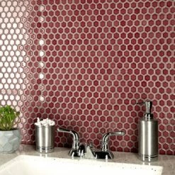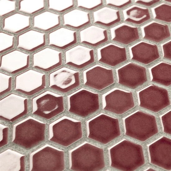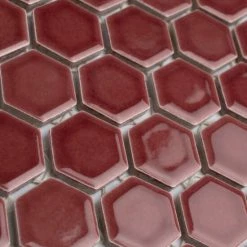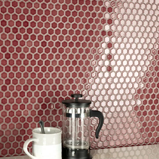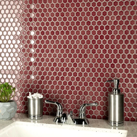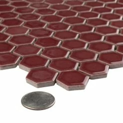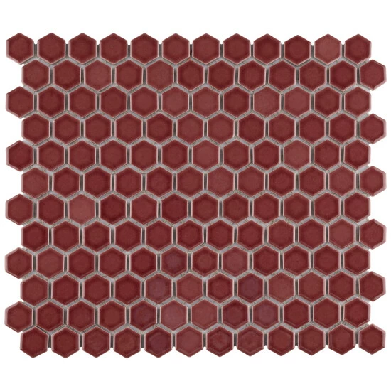 Lending a unique touch of color, our Tribeca 1 in. Hex Glossy Rusty Red 10-1/4 in. x 11-7/8 in. Porcelain Mosaic Floor and Wall Tile instantly elevates spaces through a refreshing dose of vivid geometric design. As an innovative twist on the classic hexagon, this mosaic is comprised of hexagonal chips in rich maroon tones with a smooth surface. Glossy hexagons are arranged on an interlocking mesh to create a seamless installation. This minimalistic geometric porcelain mosaic is unique yet simplistic enough to integrate into any design, ranging from traditional style renovations to modern home projects. Its impervious and frost-resistant features make this an ideal tile for both indoor and outdoor residential use, including backsplashes, bathrooms, showers and kitchens. This tile is a perfect choice on its own or paired with other products in the Tribeca Hex Mosaic Collection. Tile is the better choice for your space. This tile is made from natural ingredients, making it a healthy choice as it is free from allergens, VOCs, formaldehyde and PVC.