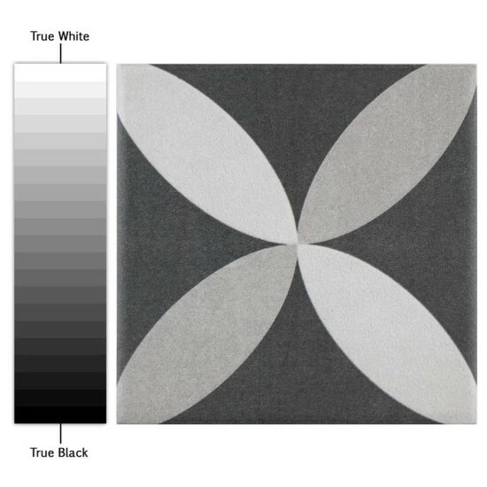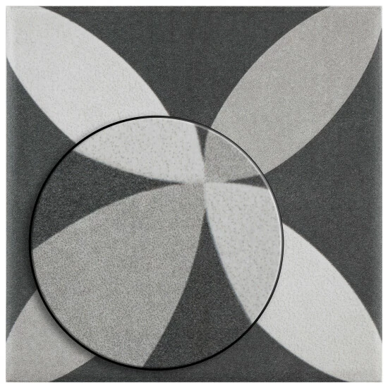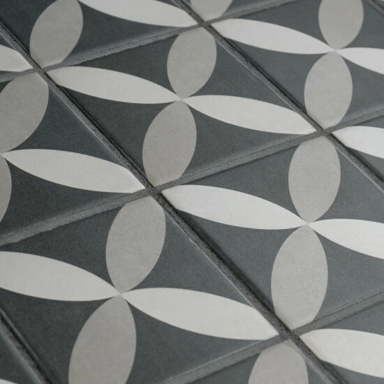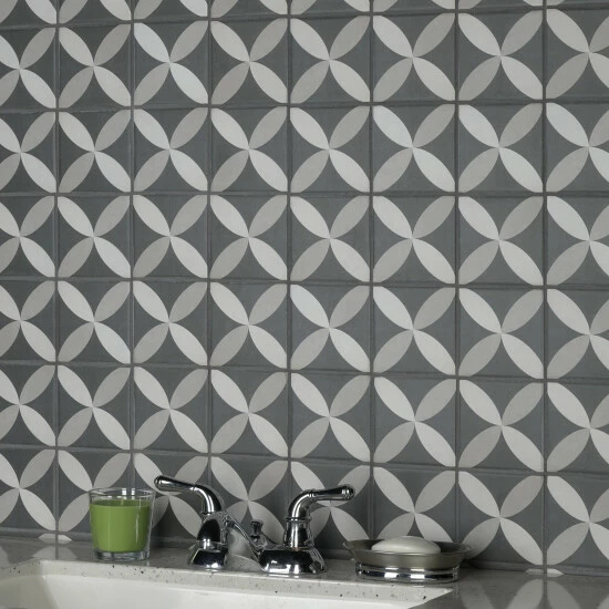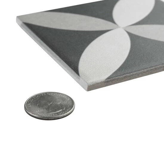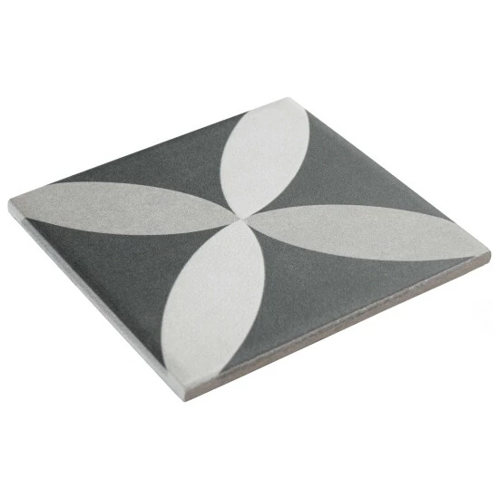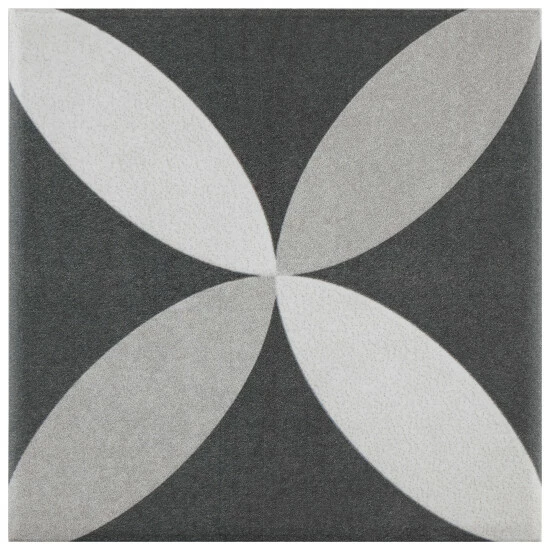 Inspired by artisan cement tiles, our Twenties Petal Mini 4 in. x 4 in. Ceramic Floor and Wall Tile captures the look of authentic encaustic tiles with a versatile ceramic body. Inspired by our Twenties Petal 7-3/4 in. x 7-3/4 in. Ceramic Floor and Wall Tile, this smaller version e features geometric patterns in snow white and ash grey tones that blend to create a floral design. Set on a charcoal black base glaze, the contrasting design features a weathered, speckled look, replicating the beauty of Spanish design and offering a unique blend of old-world style and modern appeal. This visually rich floor and wall tile can blend into virtually any design theme, ranging from contemporary projects to traditional installations. Its durable and frost-resistant features make this an ideal choice for indoor and outdoor installations including kitchens, bathrooms, backsplashes, showers, entryways, patios and fireplace facades. It is a perfect choice on its own or paired with other product in the Twenties Mini Collection. Tile is the better choice for your space. This tile is made from natural ingredients, making it a healthy choice as it is free from allergens, VOCs, formaldehyde and PVC.