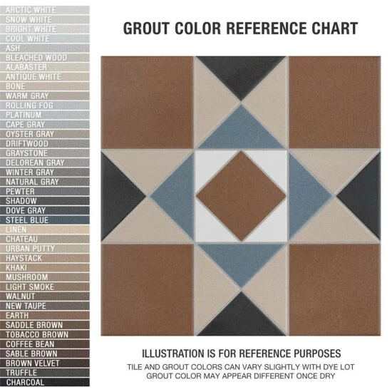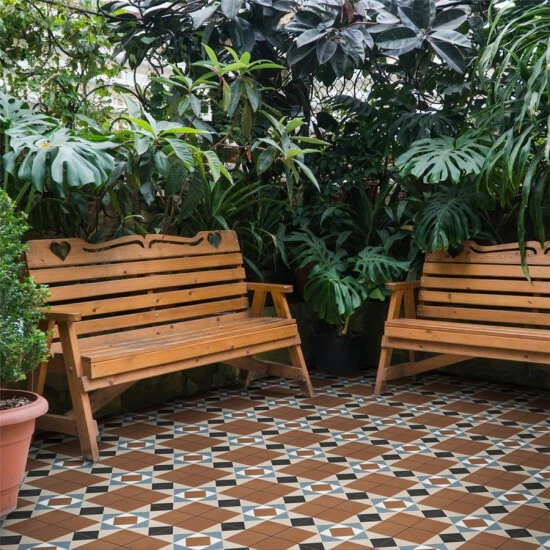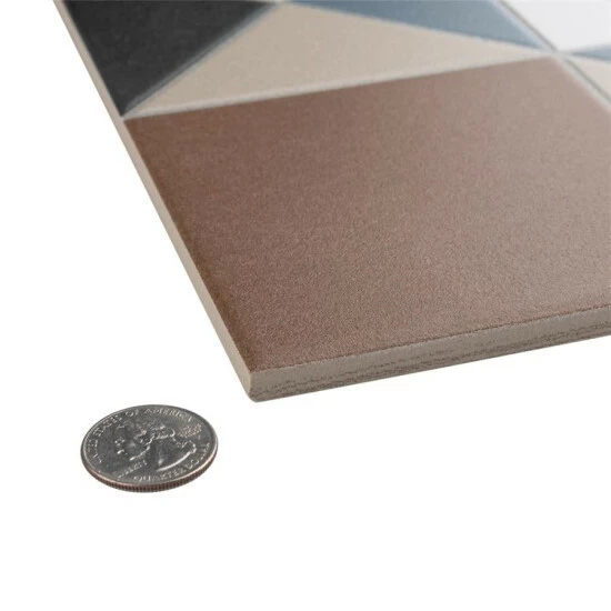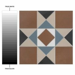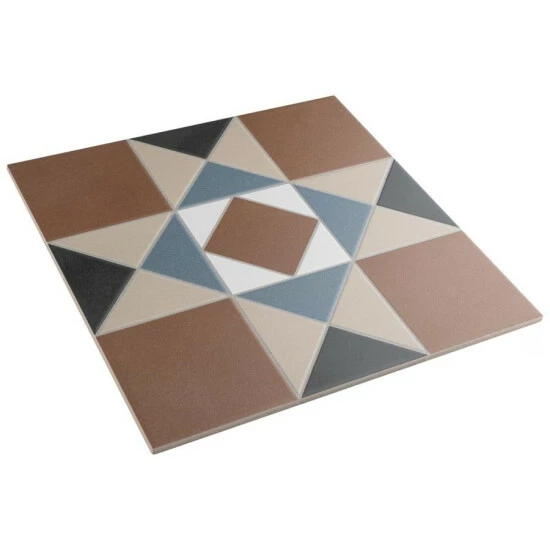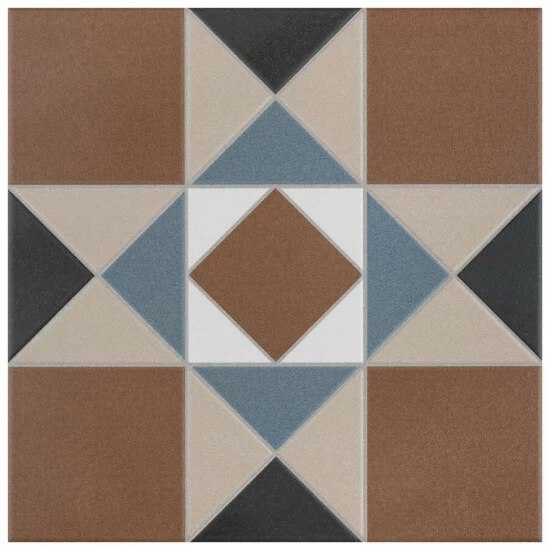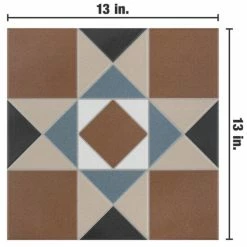 If you want a distinctive geometric mosaic look without the labor of assembly, the Vanity Cotto 13 in. x 13 in. Porcelain Floor and Wall Tile is perfect for you. This square matte tile features a glaze with realistic-looking grout lines edged around the triangles and squares. Dramatic rust brown glaze is offset by smoke blue and beige to form a rustic star pattern with sharp angles. These durable tiles are suitable for just about any interior application and will add a tasteful rustic touch to your space.