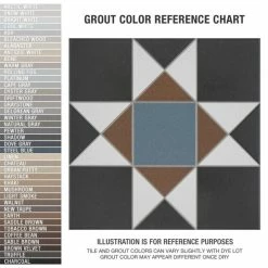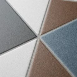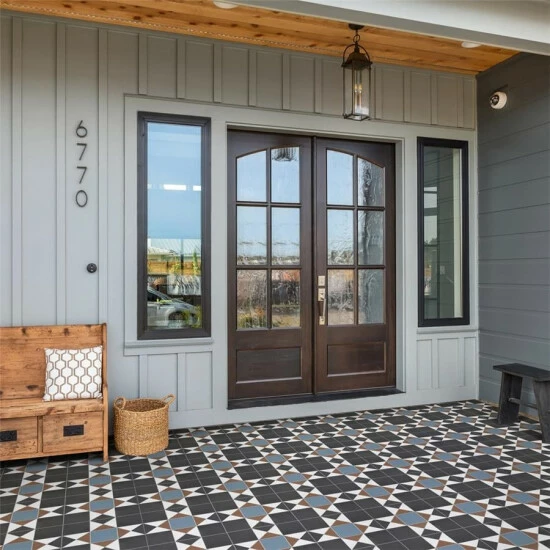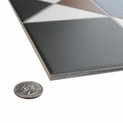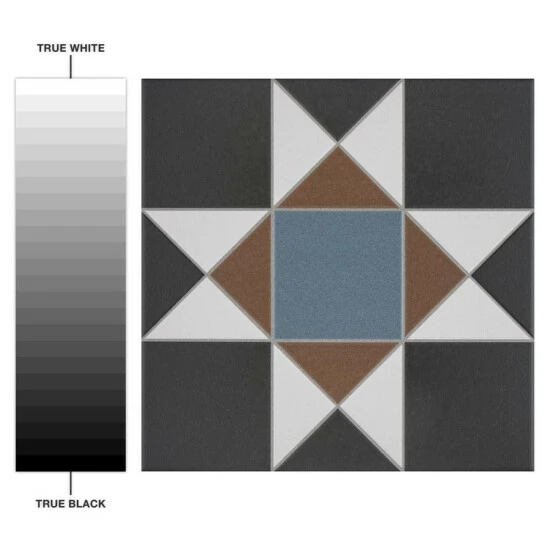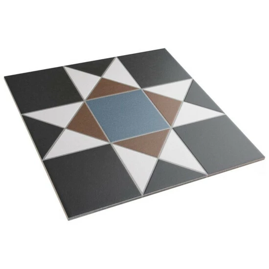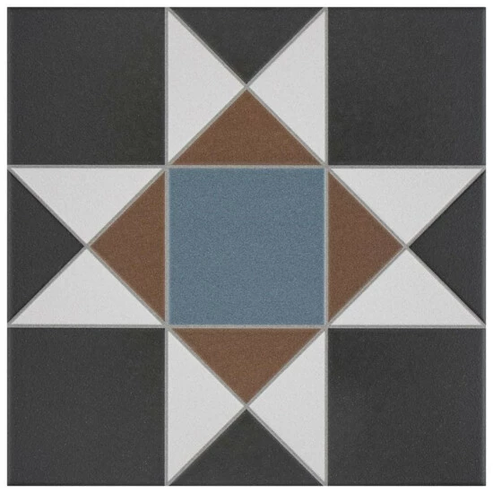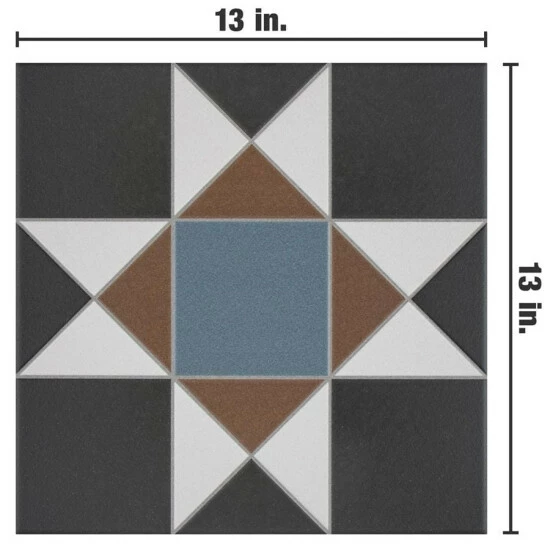 If you want a distinctive geometric mosaic look without the labor of assembly, the Vanity Nouveau 13 in. x 13 in. Porcelain Floor and Wall Tile is perfect for you. This square matte tile features a glaze with realistic-looking grout lines edged around the triangles and squares. Dramatic black glaze is offset by blue and rust brown to form a rustic star pattern with sharp angles. These durable tiles are suitable for just about any interior or outdoor application and will add a tasteful rustic touch to your space.