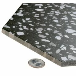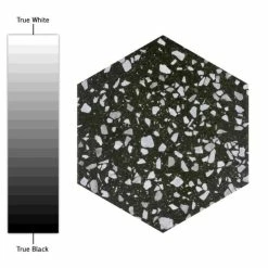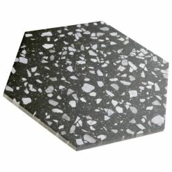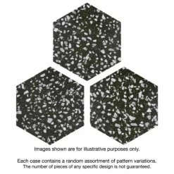 Replicating a worn concrete appearance with floating fragments of stones, our Venice Hex Black 8-5/8″ x 9-7/8″ Porcelain Floor and Wall Tile lends a burst of terrazzo-look energy to any space. This hexagon tile features speckled pattern variations in light grey and white tones that are set on a charcoal black base glaze, offering dramatic contrast and dimension to the design. The slightly textured, matte surface features a weathered, mottled look, replicating the beauty of aged stone. This trendsetting display of speckled monochromatic tones is visually appealing and versatile, and blends beautifully with a range of design styles from vintage industrial to modern day. Its impervious and frost-resistant features make it an ideal choice for indoor and outdoor floor and wall installations including kitchens, bathrooms, backsplashes, showers, entryways and patios. Tile is the better choice for your space. This tile is made from natural ingredients, making it a healthy choice as it is free from allergens, VOCs, formaldehyde and PVC.
