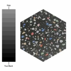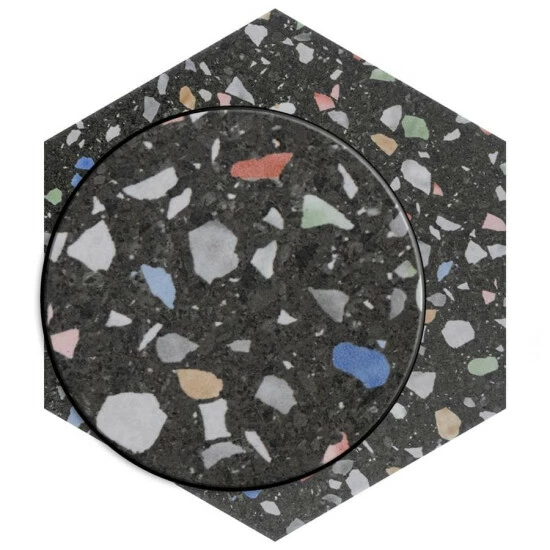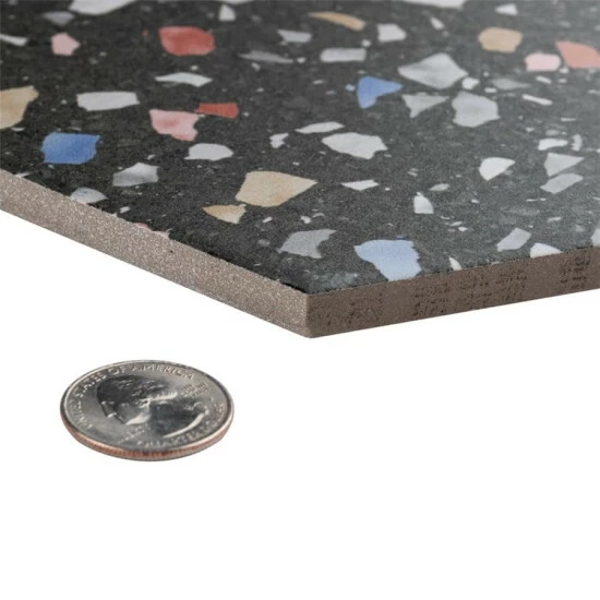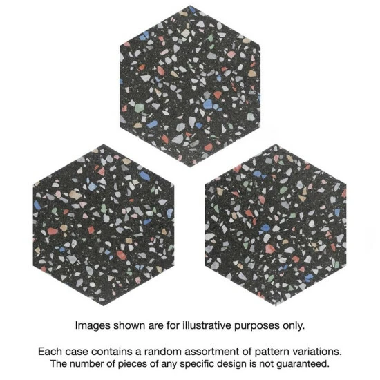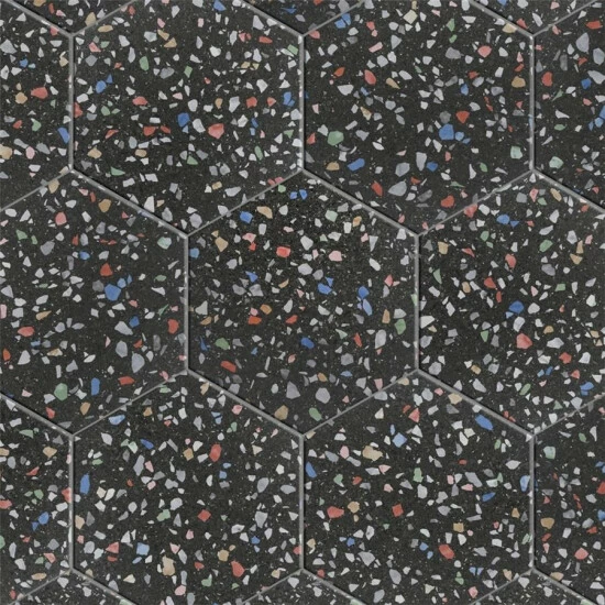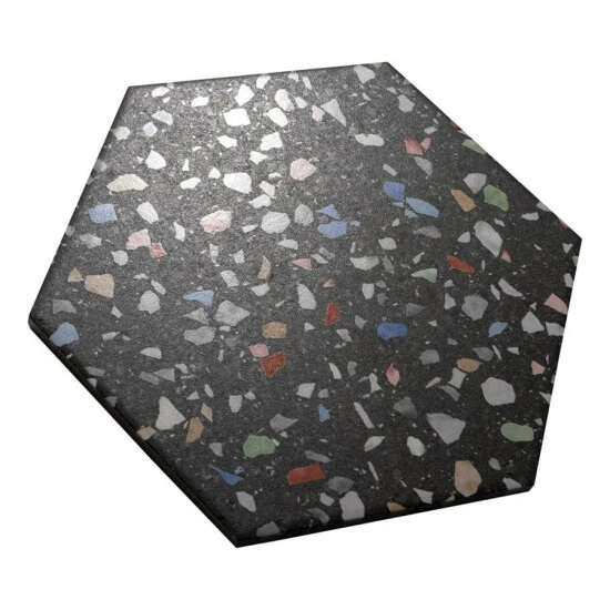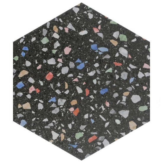 Replicating a worn concrete appearance with floating fragments of colorful stones, our Venice Hex Colors Dark 8-5/8″ x 9-7/8″ Porcelain Floor and Wall Tile lends a burst of terrazzo-look energy to any space. This hexagon tile features speckled pattern variations in bright colored tones that are set on a charcoal black base glaze, offering playful contrast and dimension to the design. The slightly textured, matte surface features a weathered, mottled look, replicating the beauty of aged stone. This trendsetting display of speckled color is visually appealing and versatile, and blends beautifully with a range of design styles from vintage industrial to modern day. Its impervious and frost-resistant features make it an ideal choice for indoor and outdoor floor and wall installations including kitchens, bathrooms, backsplashes, showers, entryways and patios. Tile is the better choice for your space. This tile is made from natural ingredients, making it a healthy choice as it is free from allergens, VOCs, formaldehyde and PVC.