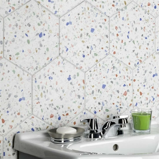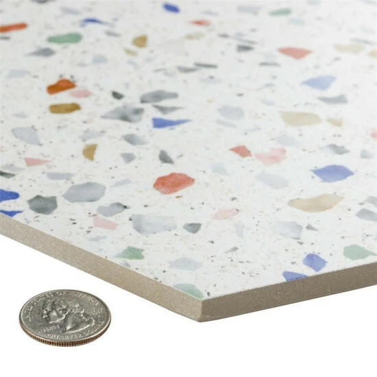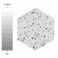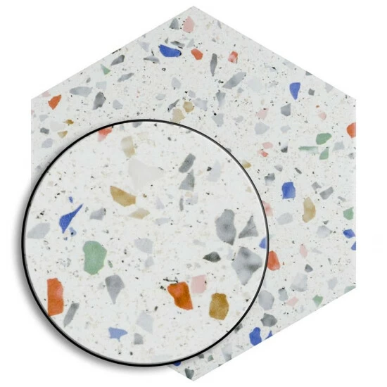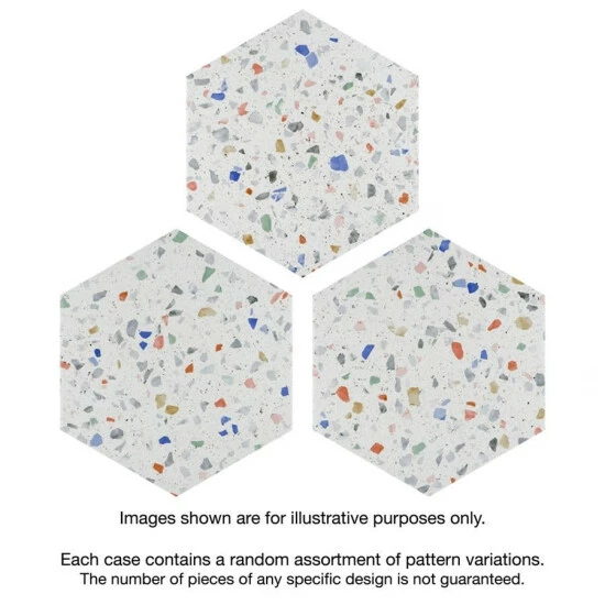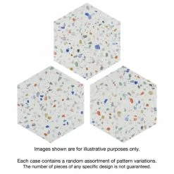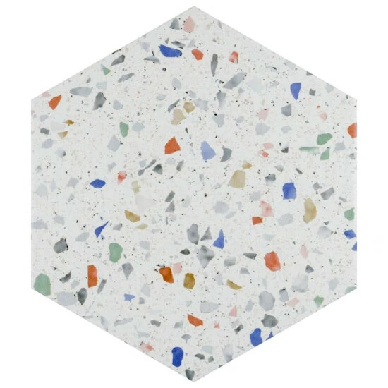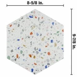 Replicating a worn concrete appearance with floating fragments of colorful stones, our Venice Hex Colors Light 8-5/8″ x 9-7/8″ Porcelain Floor and Wall Tile lends a burst of terrazzo-look energy to any space. This hexagon tile features speckled pattern variations in bright colored tones that are set on an off-white base glaze, offering playful contrast and dimension to the design. The slightly textured, matte surface features a weathered, mottled look, replicating the beauty of aged stone. This trendsetting display of speckled color is visually appealing and versatile, and blends beautifully with a range of design styles from vintage industrial to modern day. Its impervious and frost-resistant features make it an ideal choice for indoor and outdoor floor and wall installations including kitchens, bathrooms, backsplashes, showers, entryways and patios. Tile is the better choice for your space. This tile is made from natural ingredients, making it a healthy choice as it is free from allergens, VOCs, formaldehyde and PVC.