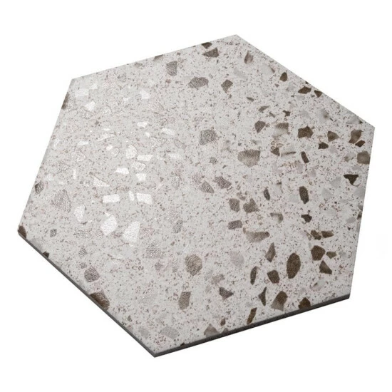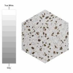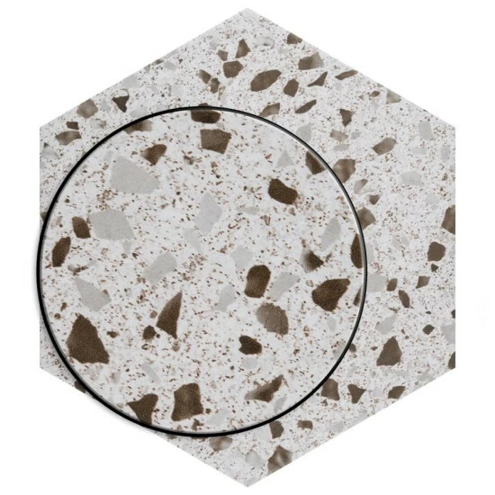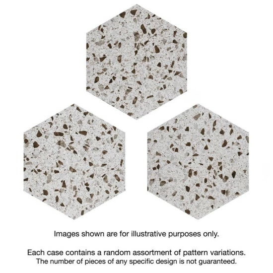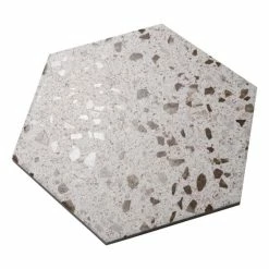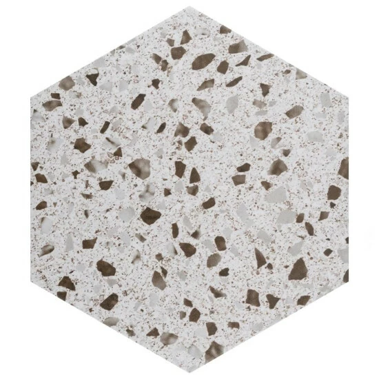 Replicating a worn concrete appearance with floating fragments of stones, our Venice Hex XT White 8-5/8″ x 9-7/8″ Porcelain Floor and Wall Tile lends a burst of terrazzo-look energy to any space. This hexagon tile features speckled pattern variations in grey and brown tones that are set on an off-white base glaze, offering subtle contrast and dimension to the design. The slightly textured, matte surface features a weathered, mottled look, replicating the beauty of aged stone tile. This trendsetting display of speckled neutral tones is visually appealing and versatile, and blends beautifully with a range of design styles from vintage industrial to modern day. Its impervious, frost-resist, and durable features make it an ideal choice for both commercial and residential indoor and outdoor installations including kitchens, bathrooms, backsplashes, showers, entryways and patios. Its impervious, frost-resist, and durable features make it an ideal choice for both commercial and residential indoor and outdoor installations including kitchens, bathrooms, backsplashes, showers, entryways and patios. Tile is the better choice for your space. This tile is made from natural ingredients, making it a healthy choice as it is free from allergens, VOCs, formaldehyde and PVC.