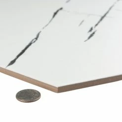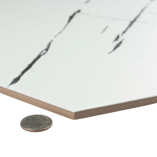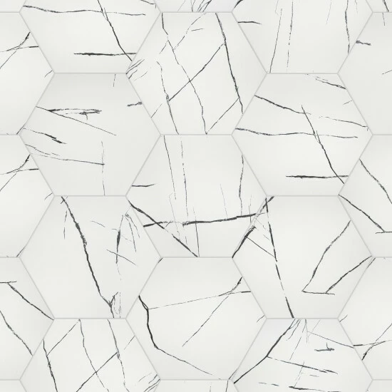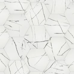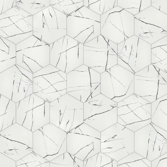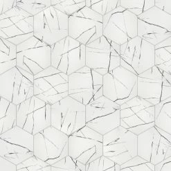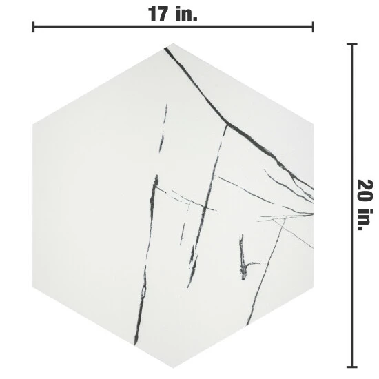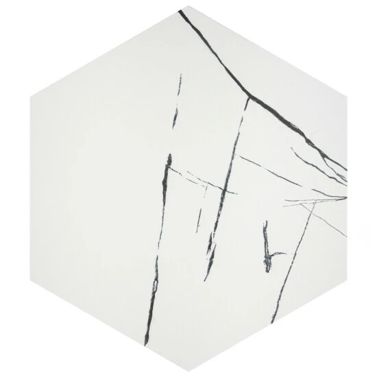 Blending state of the art ink-jet technology and creative design work, our Visium White Hex Porcelain Floor and Wall Tile offers a truly unique marble-look design. Set on a smooth, off-white matte base glaze, this tile is complemented with black veining striations that sporadically flow throughout the design for added authenticity and playful visual appeal. This trendsetting display of energetic geometric design is visually appealing and versatile, and blends beautifully with a range of styles from traditional to modern day. Available in 16 different print variations that are randomly distributed throughout each case, this tile offers a one-of-a-kind look. Its impervious, frost-resistant, and durable features make it an ideal choice for both commercial and residential indoor and outdoor installations including kitchens, bathrooms, backsplashes, showers, entryways, and patios. Tile is the better choice for your space. This tile is made from natural ingredients, making it a healthy choice as it is free from allergens, VOCs, formaldehyde, and PVC.